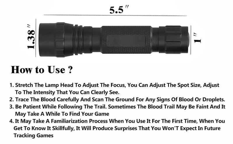 - ✅ 【Blood Tracker Flashlight】Easy On/Off Switch: An Easy-To-Locate And Use On/Off Switch Allows For Quick Activation Of The Blood Trailing Light When Needed, Without Fumbling In The Dark. Blood Trail Flashlight
